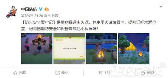 在3月20日晚间9点20分,中国消防的官微发了一条关于森林防火的宣传微博,内容是“【防火安全要牢记】易燃物品远离火源,林中用火谨慎看守,提前记好水源位置,记得把消防安全知识告诉其他小伙伴呀!”。但本该普通的宣传口号,却配上了《动森》的游戏截图。