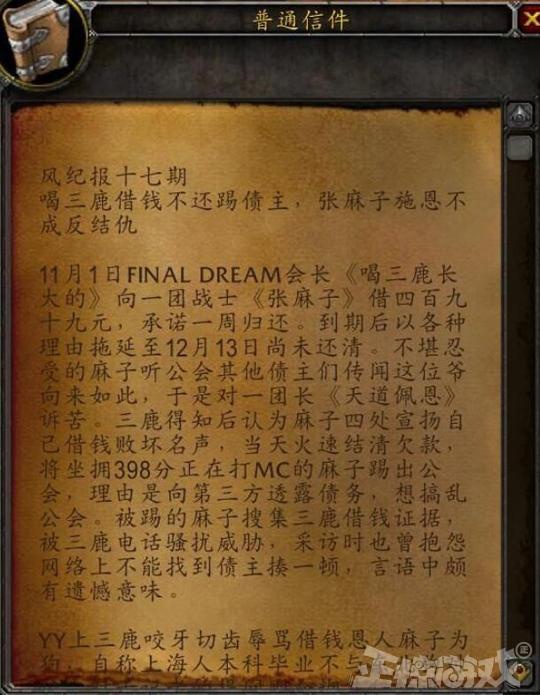 魔兽玩家骑龙龙为了满足大家的八卦心理,曝光那些人品差的玩家或者公会等原因,就在游戏里创办了《风纪报》,专门报道服里的那些八卦趣事。