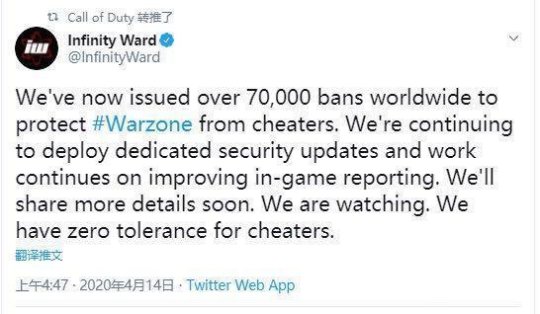 在4月14号,《使命召唤:战区》官方宣布已经封禁的账户数量超过了70000个!游戏的火热以及免费下载的零门槛都是外挂泛滥的原因之一。