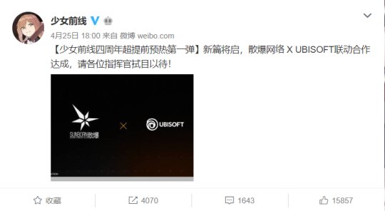 在4月25日下午6点,《少女前线》官方微博正式宣布其研发公司散爆网络与育碧达成联动合作,有玩家在看到这则消息以后长叹一口气:彩六前线终于成真了!