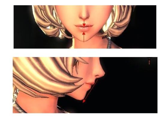 嘴巴位置上述已经说过。在鼻子和下巴中间部位。下唇到下颌的距离就是人中的长度。当然也可以比人中长出一些。有些特点。下嘴唇的厚度不要超过上唇的厚度,不然会显得“兜齿”俗话说的“地包天”特别注意!有的同学喜欢吧嘴角上翘一些。单嘴角不要上翘太多。因为进入游戏你会发现。当你笑的时候嘴会特别难看! “嘴巴突出”建议和下巴一齐。