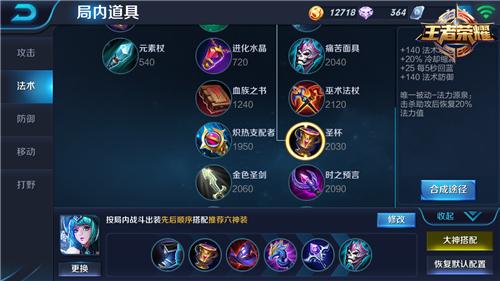 秘法之靴,圣杯,博学者之怒,回响之杖,虚无法杖,痛苦面具鞋子增加移速,减少线上时间和支援时间;圣杯减CD和回蓝,增加王昭君续航能力;博学者之怒是很多法师必出装备,强大的输出才是法师最需要的;回响之杖的被动威力不可小看,特别是对AOE技能的威力特别可观;虚空法杖提供法术穿透能力,如果你在前期在整个团队中表现得非常突出,对面的坦克很容易针对你出一些魔抗的装备,所以虚无法杖的功能是不可忽视的;痛苦面具对AOE的技能性价比是最高的,也可以为王昭君后期增加一些输出和法术穿透能力。