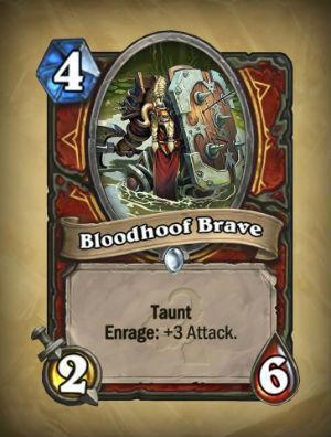 四费2/6的身材,自带嘲讽,激怒效果+3攻击力,如今早已是大部分战士必带的职业卡牌。相较于四费标准身材4/5,或是森金卫士,血蹄勇士的受益率明显更高一些,无论对于进攻或是防守端。当然,这玩意最大的问题就是怕对方的科多兽……