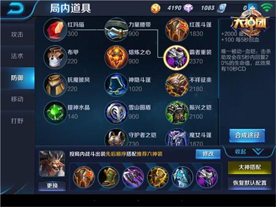 后期装备:肉装牛魔在后期装备上依旧是选择以肉为主,然后优势话可以选择捎带一件输出装备,当然前期选择出了暗影战斧就不需要再多出一件输出装备了。可以直接选择军团荣誉、振兴之铠以及霸者重装,军团荣耀是一件团队装备,增加全队的输出和减伤,作为一个辅助英雄,牛魔一定要有这个觉悟,在后期团战中会有很大帮助。振兴之铠则是魔抗装备,可以用于法术减伤,同时被动效果配合霸者重装可以超高的回血效果,提高团战的续航能力。霸者重装是大后期肉装,大幅提高牛魔的生命值,以及被动配合振兴之铠的回血量相当恐怖。