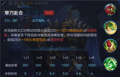 1、关羽的初始1技能伤害奇低,只有区区250点固值伤害,堪称1级AD系列技能当中之最,但是每级250点固值伤害成长,满级1500点固值伤害又是当前召唤师峡谷空前的