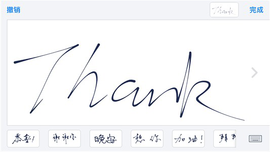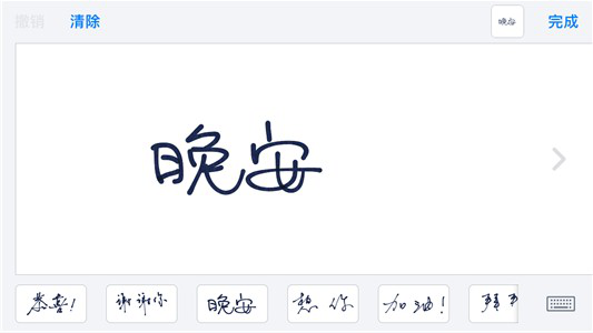 可能你会问手写板去哪了,其实只要你把手机横过来就可以进入手写模式了(或者点选全键盘右侧的按钮),系统预先内置了“晚安”、“加油”、“谢谢你”等 手写短语,当然你也可以发挥自己的想象力给对方写点什么,帅气的签名也好,可爱的图形也罢,似乎彼此之间的距离一下子被拉近了。