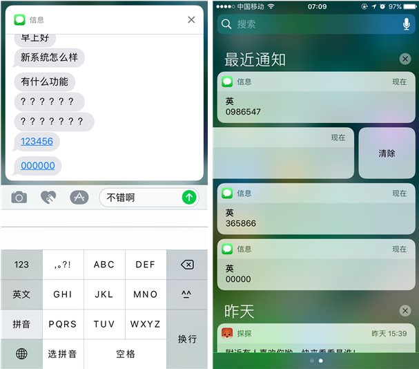 顶部下拉为通知页面这一点没有变化,与原来 iOS 9半透明的整体式风格不同,iOS 10的通知显示效果采用了模块化设计,这里的每一条通知都是独立的一个模块,可以很清晰地看到每个通知来自哪些应用,是何时收到的通知,在这里查看详细的 通知信息也是可以的,而在锁屏状态下收到通知的时候背景并不会变暗,用户可以在这里向左滑动每个通知进而“清除”,也可以直接一键清空所有通知,整个界面 看起来要更加紧凑和清晰。