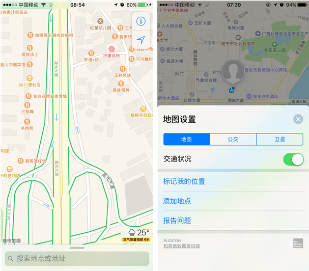 iOS 10的地图应用集成了更多的实用功能,在这里你除了可以查看自己所处的位置外,还能够查看附近的服务设施,比如餐馆、加油站等等,地图应用支持餐馆预约、 叫车等服务(目前大部分第三方服务还没有正式上线),更强大的是提示你当前路况。当然了,Siri 也与地图应用进行了对接,它会记录下每一次的地图使用情况,包括停车位置,餐馆预约等,当你要前往常去的地点时,地图会第一时间给出一个最快捷的路径,导 航过程中可以拖动和缩放地图,与 Siri一样,地图应用未来会与更多的第三方对接,支持更多的第三方服务功能。