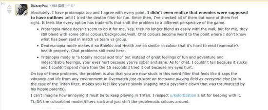 目前该文章在外国论坛以及被顶了2万多次,真正的可以说是引起了广大守望先锋玩家的共鸣。 确实小编自身也是一个protanopia,之前看到守望先锋的色盲模式也是非常精细。但事实上,我将所有模式都试了一下,基本上没有多大的作用。