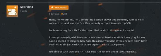 日前一位外国玩家在守望先锋的暴雪官方论坛诉说了自己作为一个色盲玩家的故事,希望暴雪能修复色盲模式。
