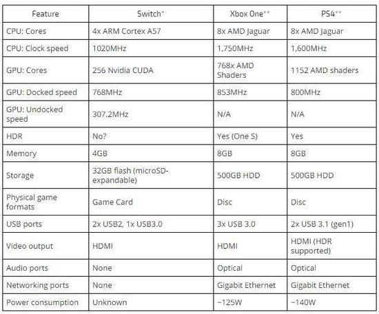 也许对于普通玩家来说,这些数字有点枯燥,不过来自于NVIDIA的技术的确是了不起的配置。Switch的CPU和GPU都是基于NVIDIA Tegra X1处理器,不考虑屏幕和其他组件时,最大功耗不过15w,而PS4和Xbox One则要高出很多。