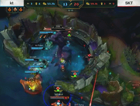 这一波原本是SKT追击KT的大好局面,结果Smeb兰博传送下来一个大招扭转战局。配合Mata锤石钩子直接烤死Faker瑞兹,再杀卡尔玛。