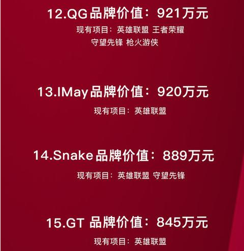 LPL春季赛中另外四只LPL战队QG、IMay、Snake、GT所属俱乐部也进入榜单前15中,分别位于12-15名,并且从榜单上看,最低的GT俱乐部品牌价值也达到了845万元。