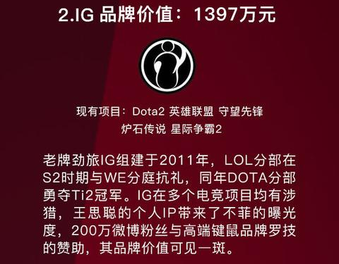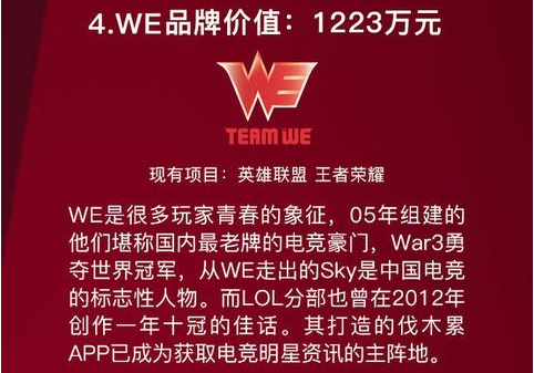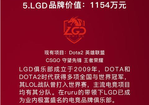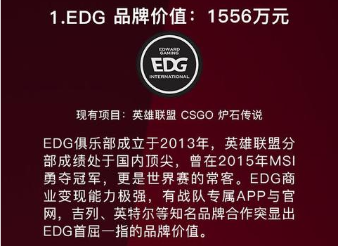 EDG作为一个2013年才成立的俱乐部,相比较其他老牌俱乐部来可以说是一个新人,而正是这样一个俱乐部夺得了榜单的第一名,并且其旗下的LOL战队EDG也是LPL中的豪门战队,四夺LPL冠军。
