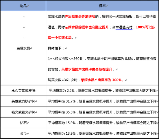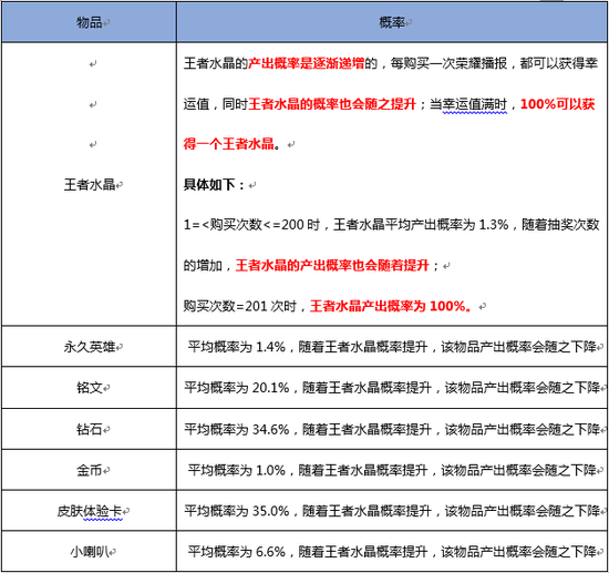 应国家有关法律规定,《王者荣耀》对游戏内随机玩法中物品产出概率公布如下: