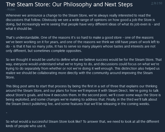 官方认为,用户和开发者群组之间经常存在利益冲突,是造成 Steam 商店的设计具有挑战性的根本原因。Steam认为,打造一个让所有人都满意的商店页面才更有意义。