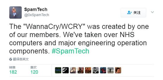 今天凌晨,一名ID为@SpamTech 的Twitter用户发布消息称,勒索病毒是由其团队一名成员开发的。并表示团队已经攻下了NHS的电脑和主要的工程系统运行模块。