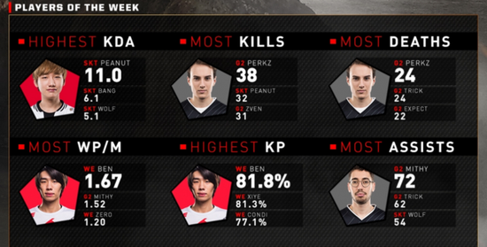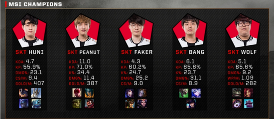 SKT战队的辅助选手Wolf场均KDA为5.1;参团率为百分之65.6;造成伤害比率为全队的百分之9.2;平均每分钟插眼数为1.09;平均每分钟的拿到的经济高达282。他在四场比赛中分别选择了河流之主、荆棘之兴、仙灵女巫、弗雷尔卓德之心为自己的出场英雄。(转自腾讯游戏)