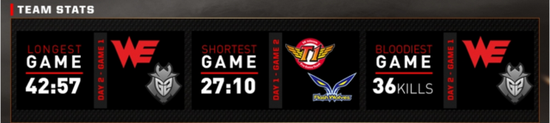 MSI淘汰赛第二日比赛中,WE战队与G2战队的第一场比赛耗时最长,一共用时42分57秒。而耗时最短的比赛仅用27分10就结束,这是来自淘汰赛首日SKT T1战队对阵FW战队的第二场比赛。而出现击杀最多的比赛则是淘汰赛第二日WE战队对阵G2战队的第一场比赛,全场一共出现36次击杀,位居淘汰赛最高。而在那场比赛中,WE战队前期占优的情况下被G2战队逆转。