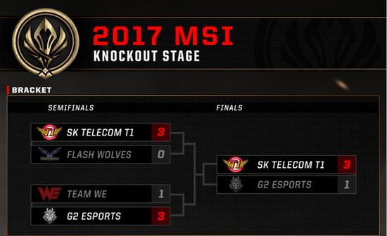 经历了小组赛的残酷考验,进入本届英雄联盟季中邀请赛淘汰赛的共有四支队伍,他们分别是来自韩国LCK赛区的SKT T1战队、中国LPL赛区的WE战队、欧洲LCS赛区的G2战队、港澳台LMS赛区的FW战队。半决赛的分组对阵是SKT T1战队对阵FW战队,WE战队对阵G2战队。最终SKT T1战队3比0战胜FW战队晋级决赛,G2战队3比1战胜WE战队晋级决赛。MSI决赛中,SKT T1战队3比1战胜G2战队再次捧起冠军奖杯。