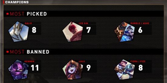 英雄禁用方面,狂暴之心位居榜首,一共被禁用11次;第二名是仙灵女巫,一共被禁用9次;第三名的无双剑姬和潮汐海灵被禁用次数相同,一共被禁用8次。