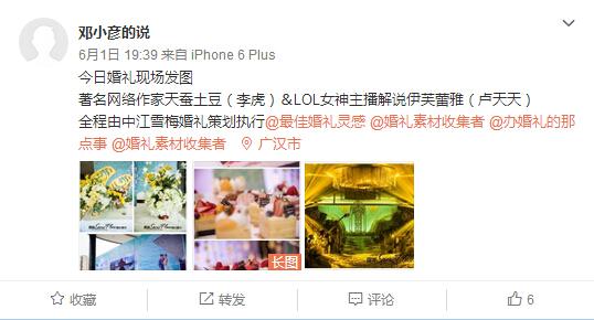 小伙伴们,你们没有看错,就是这两个人,在6月1日结婚了。对于他们两个怎么相识Aggro君不得而知,但是有一点可以确定的就是,看堂姐直播的观众里肯定有一部分天蚕土豆的粉丝,这部分粉丝应该挺高兴的,毕竟下一次豆一更再拖更,就可以去堂姐直播间催更了。