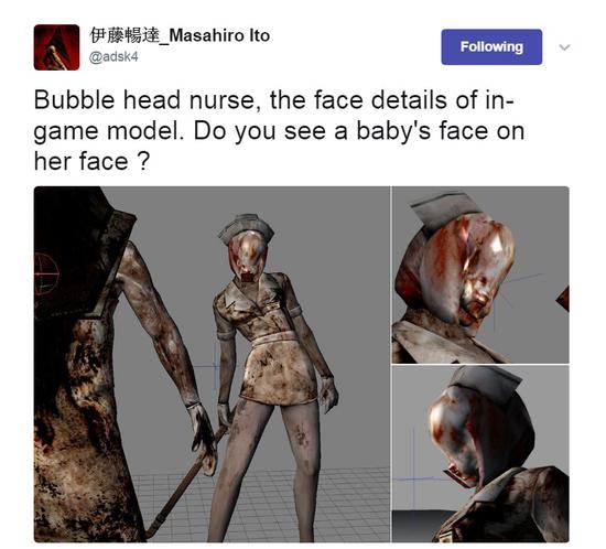 前三代《寂静岭》中的怪物都由伊藤畅达创作,包括玩家们最为熟知的三角头。这一次伊藤畅达介绍的主要是护士怪物,他在推特上展示了护士的游戏内模型的脸部细节,他表示在这种怪物的脸部其实是一个婴儿的脸。而至于为什么要运用婴儿脸的造型,伊藤畅达回答说:这其实James(《寂静岭2》主角)和Mary愿望的象征,这种愿望残余遗留下来的部分就体现在了怪物的身上。