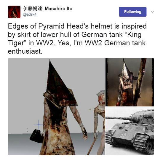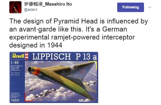 而至于为什么护士嘴部会出现红色的方块,伊藤畅达回答:这其实是和红色九宫格有点关联。而最有趣的部分则还是和三角头相关:这种怪物代表性的三角形头盔其实还是受到了二战时德军虎王坦克的启发。伊藤表示,三角头头盔的边缘有一圈延伸出来的“挡板”部分,而这部分造型实际上是受了虎王坦克履带附近的挡板启发。而至于三角头的整体造型,来源于1944年德军设计的一种实验型冲压式动力截击机,可以看到这个造型来源也是非常的前卫。伊藤畅达表示自己实际上是一名军宅,对于二战时的德国军备有着浓厚的兴趣,可以看到他也的确获得了不少灵感。