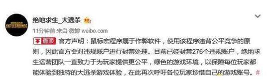 今日,《绝地求生:大逃杀》官方发表声明:鼠标宏程序属于作弊软件,使用该程序违背公平竞争的原则,因此官方会对违规账户进行封禁处理。目前已经封禁276个违规账户。官方呼吁玩家珍惜自己的账号。