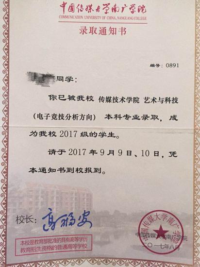 随着电子竞技行业的蓬勃发展,大家对这个行业的看法也在慢慢改变,许多大学都设立了专门的电子竞技专业。2016年12月,中国传媒大学南广学院在南京恒一文化推动下成立中国第一个电竞本科专业。该专业已于2017年正式开放招生,第一批学生将在9月正式入学。现在全国首个艺术与科技(电子竞技分析方向)本科的第一批学生已经陆陆续续收到了录取通知。