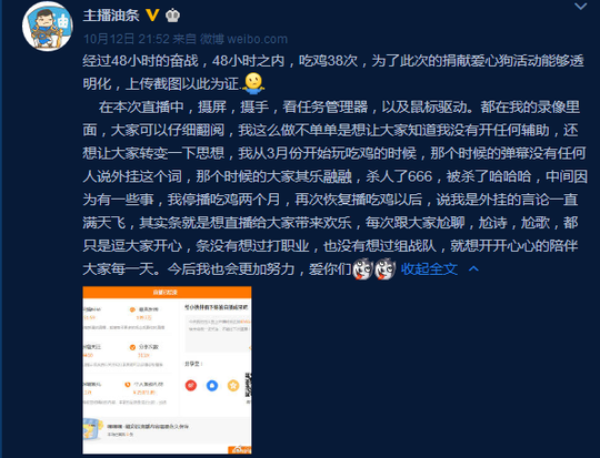 面对铺天盖地的质疑,主播油条也通过微博微博回应了此事:经过48小时的奋战,48小时之内,吃鸡38次,为了此次的捐献爱心狗活动能够透明化,上传截图以此为证。