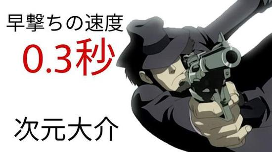 首先提到的是《鲁邦三世》里的角色次元大介,他的射击速度仅需要0.3秒(数据由设定资料集给出),作为鲁邦的有力搭档,大介大叔的枪术绝对堪称精湛,配合他冷峻的造型和细心缜密的行动风格更显潇洒。