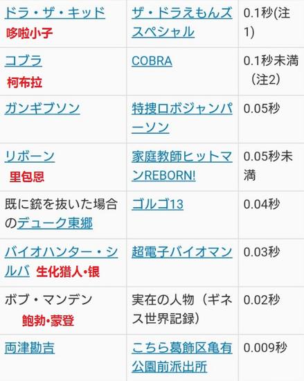 除了这位网友总结的这些角色外,日本某网站还专门对不同动漫人物的开枪射击速度进行了整合,其中包括《家庭教师》的里包恩、《乌龙派出所》的两津勘吉,甚至还有现实中存在的西部式拔枪射击名人鲍勃·蒙登(Bob Munden)。相比于大雄,这些角色的射速低至0.1秒以下,如果开枪的话肉眼真的能看到吗……