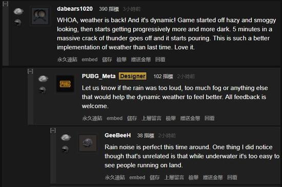 另外,也有玩家对于动态天气的回归表示非常欣慰。他进场时是朦朦胧胧的雾气,然后越来越暗,大概5分钟左右开始电闪雷鸣,之后倾盆大雨。感觉天气效果比之前要好得多,大爱。游戏设计师表示,可以反馈是不是觉得雨太大、太吵等等。另外几位玩家表示,雨声刚刚好,只不过似乎湿了的路面有点太闪,地面看起来像塑料了。