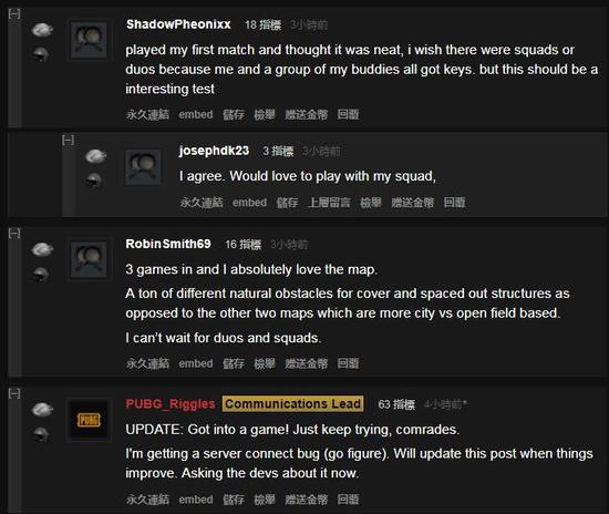 除了给出的建议之外,也有玩家吐槽服务器还是经常连不上,很影像体验,对此官方也一直在回复表示会修复。各位有没有加入测试呢?你觉得新地图玩起来怎么样?