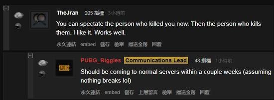 同时在论坛上,也有不少玩家在体验过之后给出了反馈信息。首先在这次测试中玩家可以看到杀死自己的人,并且也能看到杀死他们的人,效果不错。不少玩家都表示很喜欢这个功能,即可以在自己死亡之后盯住一个玩家观战。自己就喜欢看看群殴的时候最后“鹿死谁手”。而官方人员也在论坛中回复称,很高兴你们喜欢这个功能,大概会在普通服务器上线的。