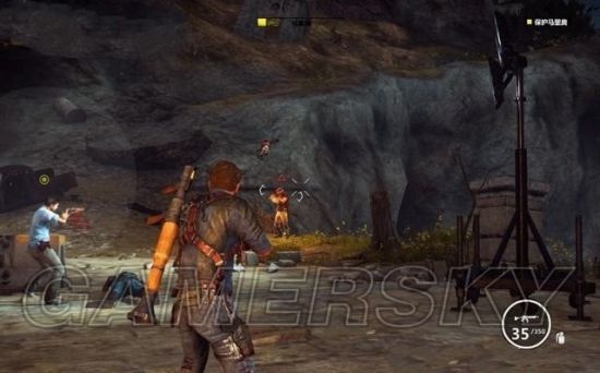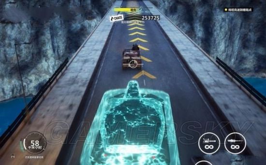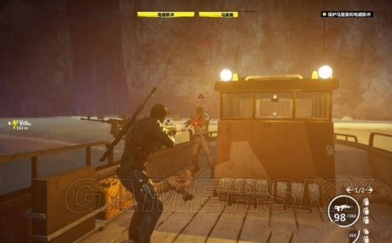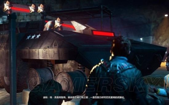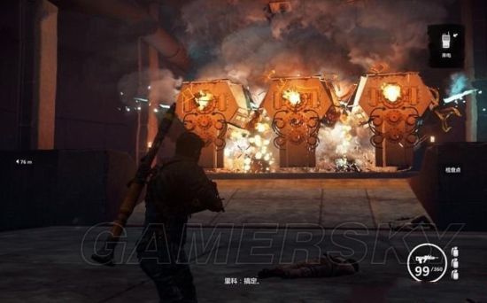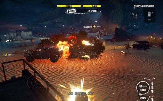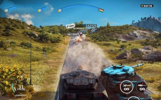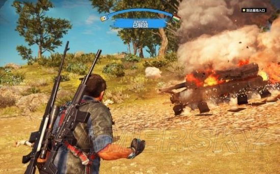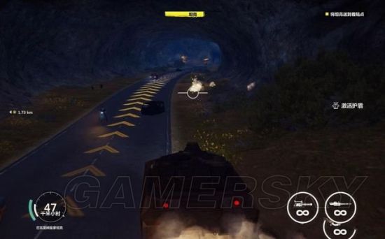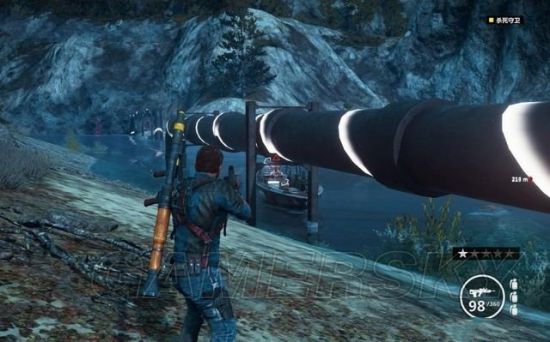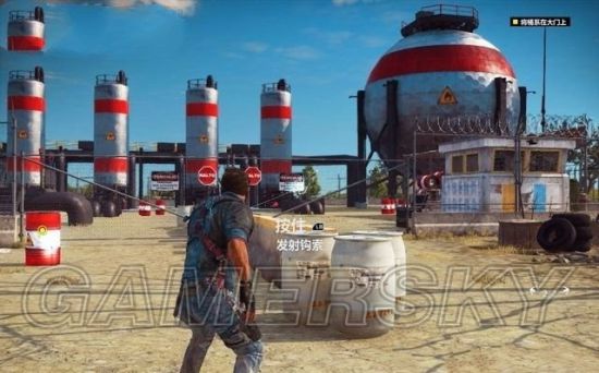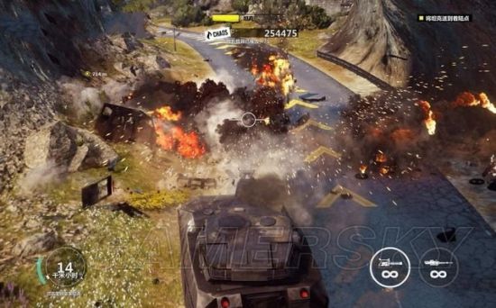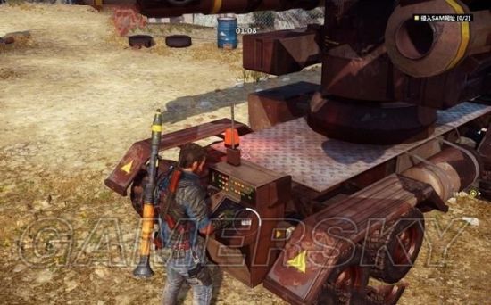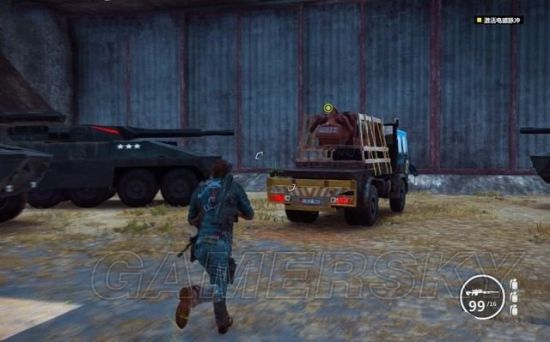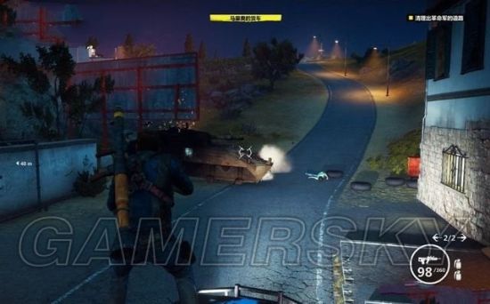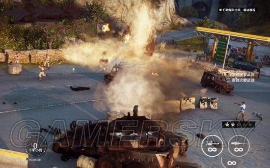 途中有毁坏的坦克车挡住道路,用钩爪将它拖开。途经加油站的时候,狙击车辆和站里的油桶。
