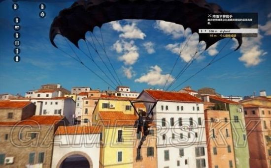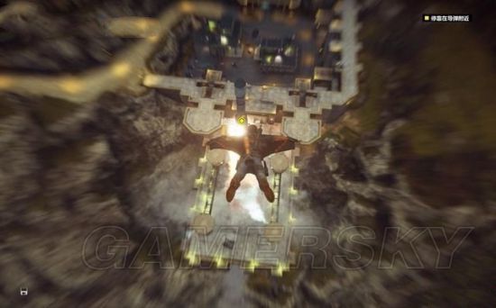 接下来测试新钩爪的性能,朝目标单击LB即可飞速推进,途中按A键打开降落伞进行远距离的飞行。在飞行中再次瞄准目标单击LB(F),可以获得助力持续的飞行。