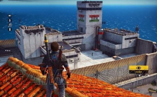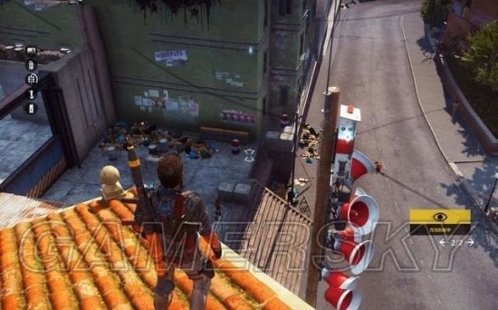 在进入一个据点后,屏幕的左上角显示出该据点的军事目标,在地图上可以看到每个目标的数量。比较容易找到的扬声器,漆成红色,站到屋顶很好发现,用钩爪将它们破坏掉。玛纳依总共有3个扬声器,然后再去破坏广告牌。