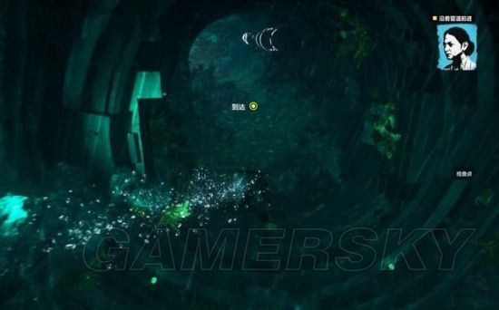 来到洞穴外面,用钩爪将搁浅的小船拖到水中,然后打开通地图,点击玛纳依选择“快速传送”。