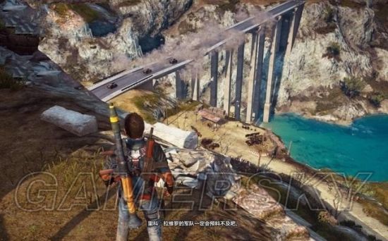 将两只GE-64安装到桥梁两侧,然后迅速飞身攀到附近的山崖。等敌人的车辆开到桥上,按引爆炸药。笔者用的手柄操作,显示的R键就是RB键。