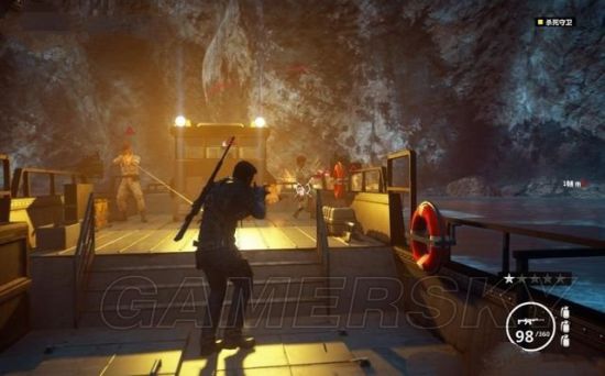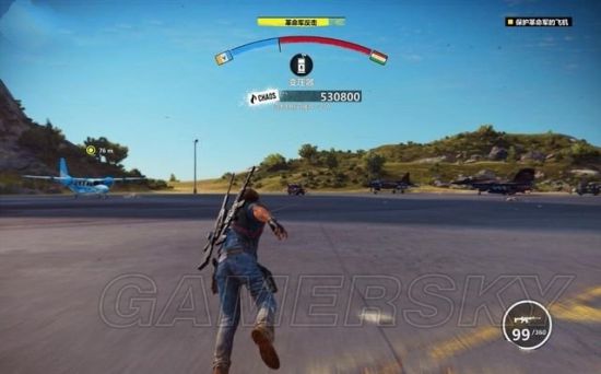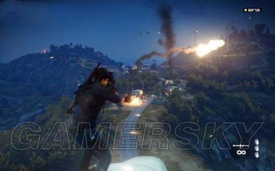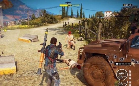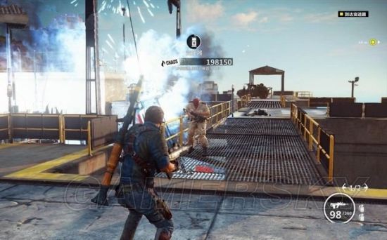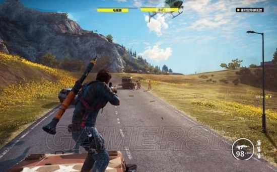 里科要消灭途中追赶堵截的敌军,他可以站在车辆上,或是悬吊在直升机上射击。也可以用钩爪飞身到敌人车辆上去劫持。