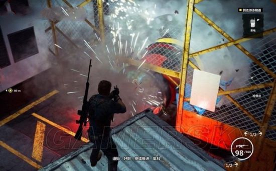来到桥中间,将武器切换至GE-64,它是迪妈给里科的新装备,一种高能爆破物。