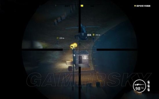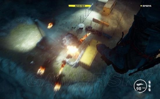 摧毁一定数量的直升机会接到提示,盟友的直升机赶来,用钩爪飞身上去。