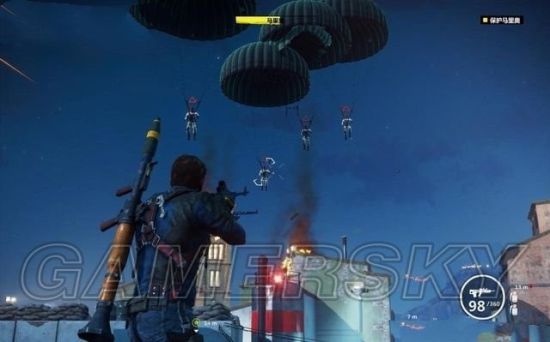 将三辆坦克摧毁后,跑到城镇门口掩护马里奥逃走。站到高处平台,居高临下清扫阻击的敌兵。随后有伞兵空投下来,全部扫杀。