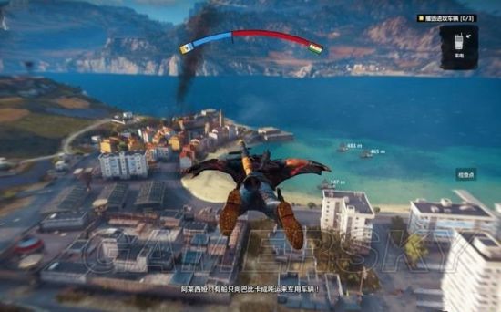 只有不到6分钟的时间,多运用降落伞和滑翔翼的技巧,利用钩爪不断的助力,维系持续的滑行。