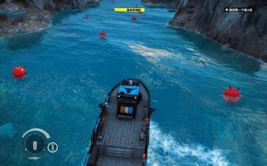 在湖边发现一艘巡逻艇,清掉上面的敌人,驾驶这艘巡逻艇摧毁湖中的另两艘,消灭所有的守卫,前往山腹中的秘密基地。