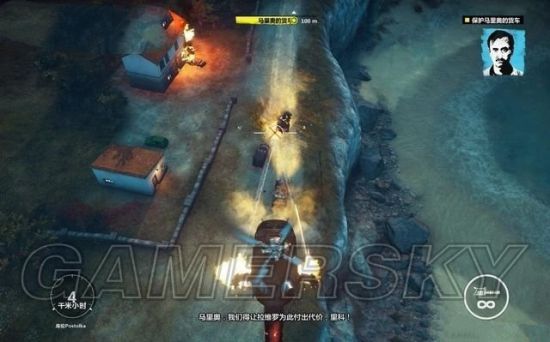 途中会遭到直升机的袭击,可以飞身上去劫持它,这样赶往目标地更加便利。在穿越希马里昂据点的时候会遭到炮袭,快速移动避开炮弹。