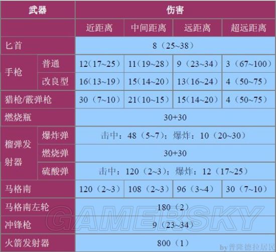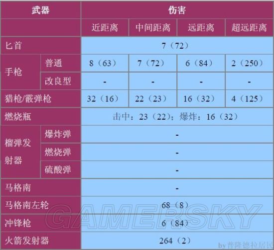 表格中,火焰瓶和榴弹发射器的伤害分为“击中”和“爆炸”两种,“击中”是指直接打中敌人;“爆炸”是指未直接击中敌人而对其造成的溅射伤害。另外,燃[咳咳]烧瓶和榴弹发射器的燃烧弹可以对部分敌人造成灼伤效果,除击中的伤害之外还会让敌人持续受到灼伤伤害。