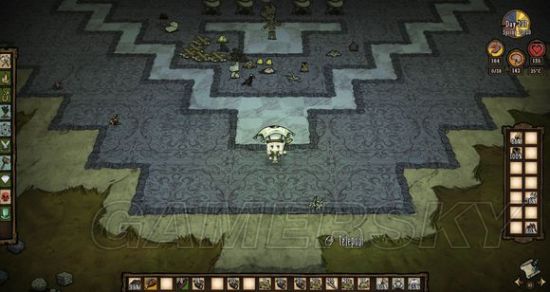 1、出生后把周围的材料采了然后靠火把连夜的赶路,争取用最短的时间把地图探个大概,不需要全部黑色区域探完(强迫症注意),只要探出猪王、沼泽、荒漠、矿区、有牛的草原、冬象窝等重要的地方在哪就行了。